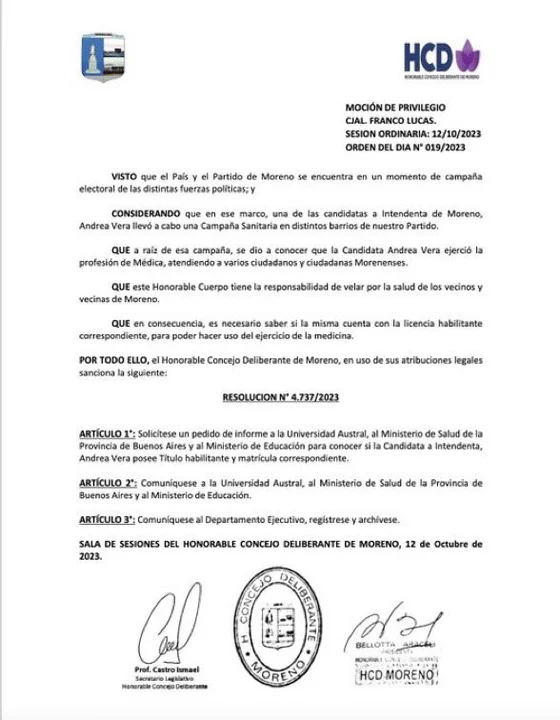 Con esa certificación, avanzaron denuncias por ejercicio ilegal de la medicina, falsificación de documentos y mala praxis, delitos que contemplan sanciones penales y civiles. Sin embargo, lejos de frenar su carrera política, Vera consolidó su lugar dentro de La Libertad Avanza. Respaldada por su padre —ex peronista y hoy armador del oficialismo en Moreno—, y con el aval de Karina Milei y Sebastián Pareja, en mayo fue designada Coordinadora de la Primera Sección Electoral. Hoy su candidatura nacional está confirmada.