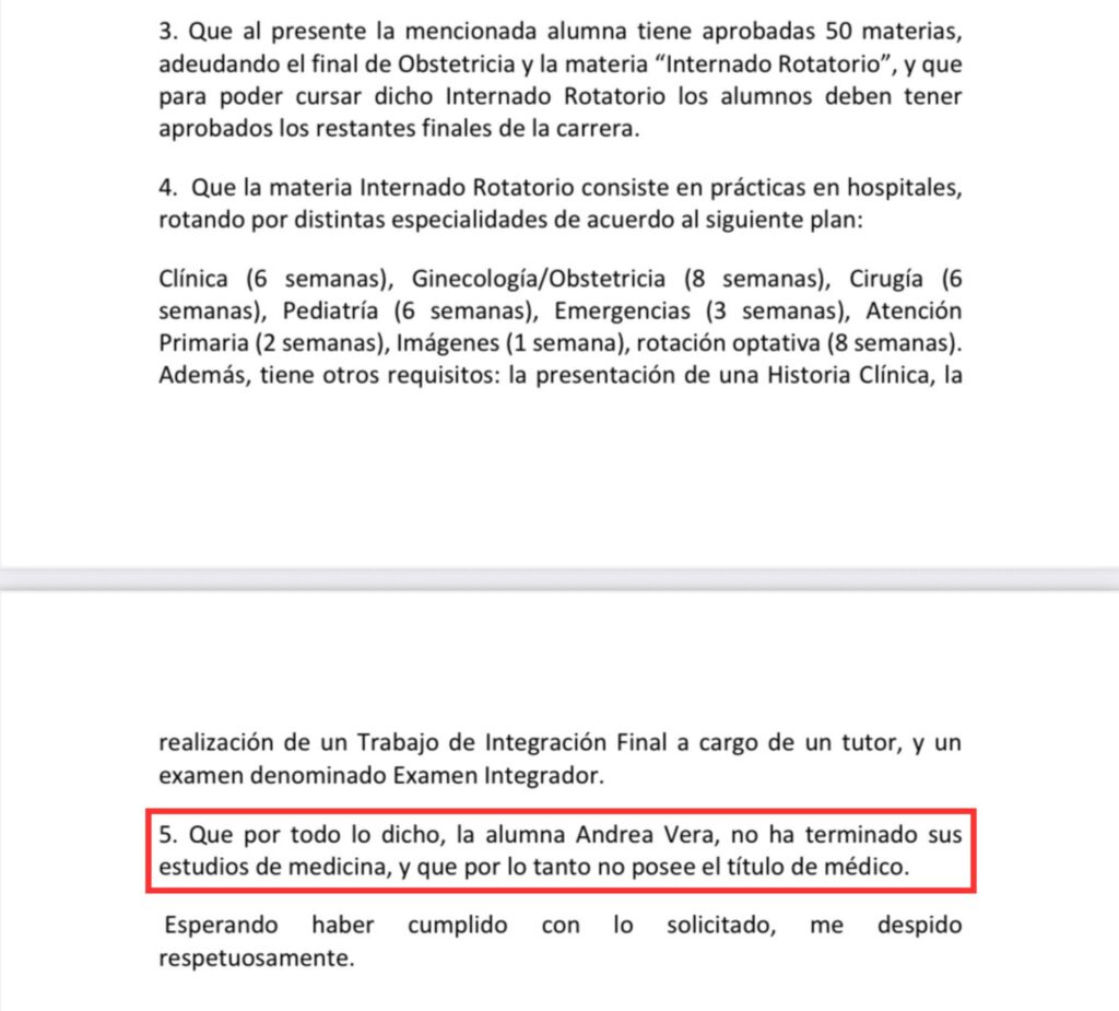 La respuesta fue categórica. En un informe firmado por el decano Guillermo Mazzolini, la Facultad de Ciencias Biomédicas de la Austral confirmó que Vera ingresó en 2013 y que tiene 50 materias aprobadas de un total de 52, pero adeuda el examen final de Obstetricia y la materia Internado Rotatorio, requisito clave que implica al menos 32 semanas de prácticas hospitalarias, un Trabajo de Integración Final y un examen integrador. “Por todo lo dicho, la alumna Andrea Vera no ha terminado sus estudios de medicina y por lo tanto no posee el título de médica”, sentenció el documento.